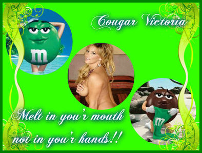 This fucking cougar loves to try new, different and kinky things. So when he suggested we play with candy my twat began to get nice and wet at the idea. I didn’t know what he had in mind and really didn’t care. My first thought was edible underwear which is way cool with me! When he pulled out a big bag of m&m’s I couldn’t for the life of me think of what he wanted to do with them. Then he pulled out another big bag of them and yet another. Three bags what the fuck? We sat at the table and divided them by color. When we got finished I was told that each color would be a different sexual thing we would do. Now my pussy was really fucking wet. That was seven colors: blue, yellow, orange, red, green, brown and black. How fucking hot this was going to be! The blue ones were for his cock and I got to eat them off his dick while a pile waited on his belly for his load. Once he shot that load on the pile I ate them too. Fucking aye! The yellow ones he placed all over my tits and licked and sucked them off one by one while driving me fucking crazy! Then he filled his mouth full of the orange ones and had me eat them out of his mouth licking the melted chocolate off his face. My cunt is so fucking hot by now I just want to cum all over the place. But not yet…he won’t let me. Next the red ones in my mouth and he is eating them out. Then the brown and black ones were for our asses. And I thought he would cum on the spot when I shoved them inside him rubbing his prostate and then eating them out again. He held out for me though, That is why I love the young guys, stamina baby! And finally the green ones, O my fucking God, the green ones….he filled my cunt with them and looked at me and said “Let’s see if these melt in your cunt not in your hands.” Fuck me I wanted to cum then and there. But I held out until he had every one shoved deep in me and then he slowly ate every one and licked me clean as I exploded all over his face. I don’t think I will ever look at an m&m the same again and I will never eat any one other then the green ones. Young studs and their kinky imaginations!